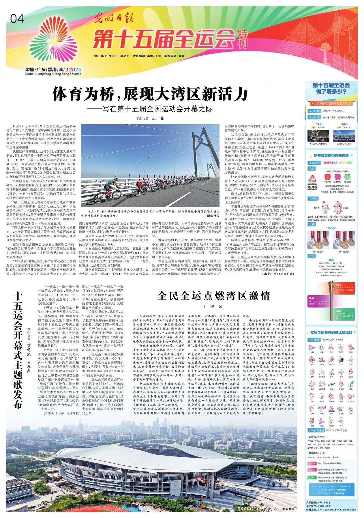 这一切,得益于粤港澳大湾区高质量发展。自《粤港澳大湾区发展规划纲要》印发以来,在这片我国开放程度最高、经济活力最强的热土上,建设粤港澳大湾区,成为新时代推动形成全面开放新格局的新尝试,也是推动“一国两制”事业发展的新实践。如今,港澳居民来大湾区内地城市就学、就业、生活更加便利,大湾区市场一体化水平进一步提升,国际科创中心建设稳步推进……建成国际一流湾区和世界级城市群,粤港澳三地正向着这一目标稳步推进。而十五运会的举办,则成为新的契机,以体育为纽带,推动三地人民增进理解、拉近距离,让湾区建设人文底色更加浓厚。